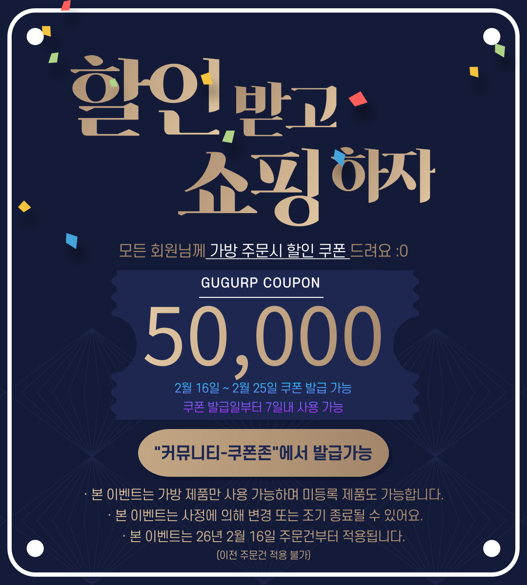 오늘 16일부터 이번달 25일까지 할인 쿠폰(50,000원) 발급되는데 가방 구매시 사용 가능한 쿠폰입니다.