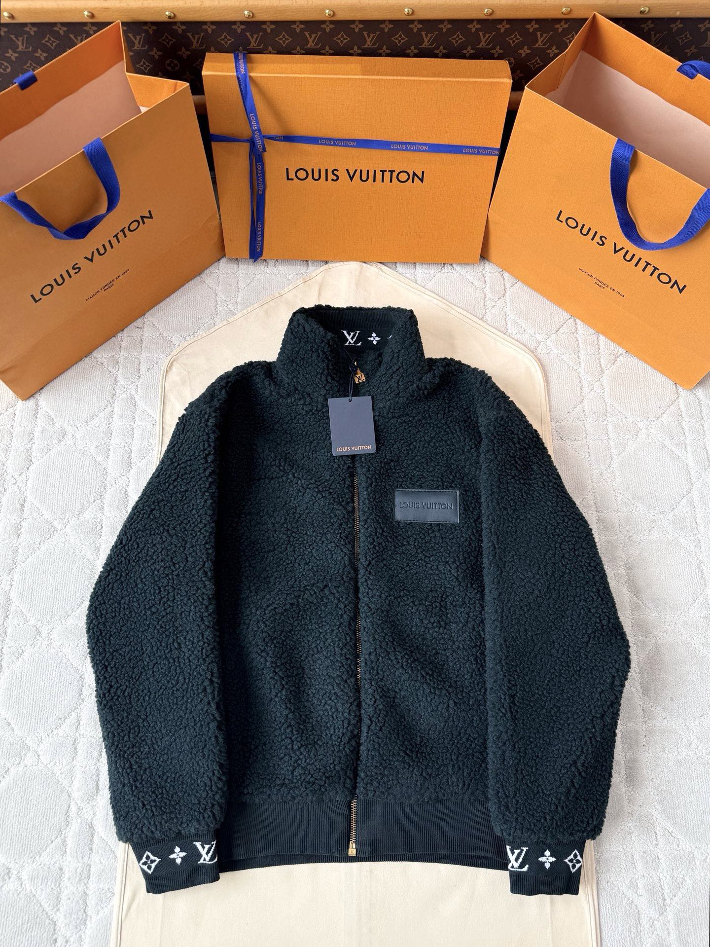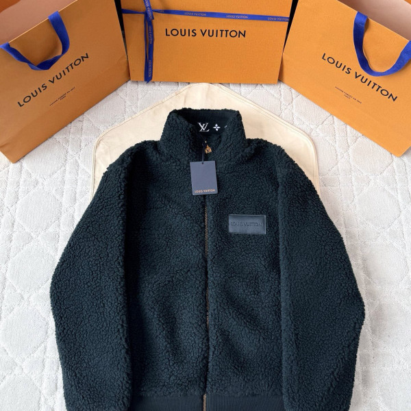 루이비통 레더 패치 플리스 블랙 그린 블루종 자켓