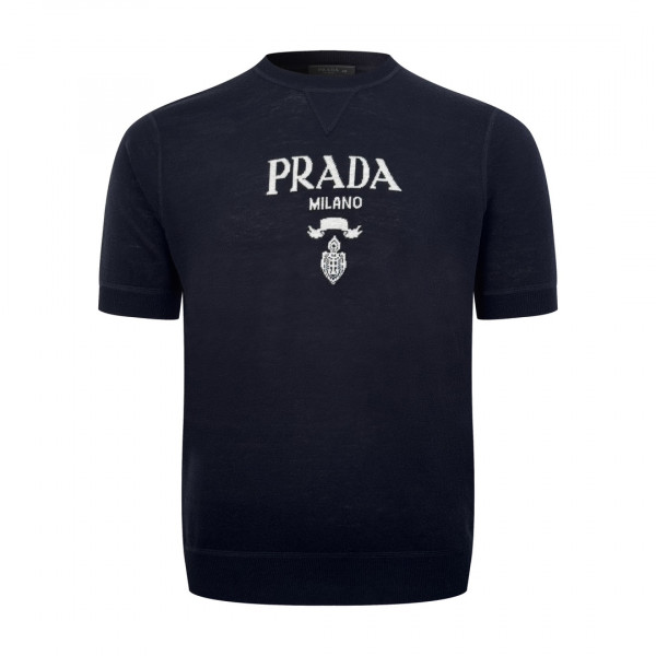 [잔디집] 프라다 로고 울 캐시미어 크루넥 네이비 반팔 니트 스웨터