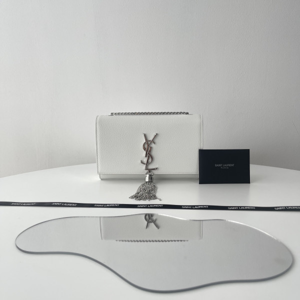 [블랙 프레임] 생로랑 그랑 드 뿌드르 엠보스 레더 태슬 케이트 체인 화이트 숄더백 474366