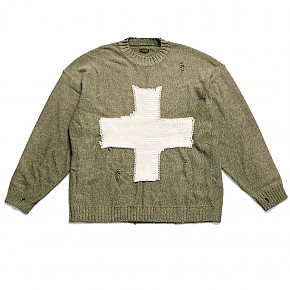 [A캪] 캐피탈 크로스 로고 데미지 카키 그린 니트 스웨터